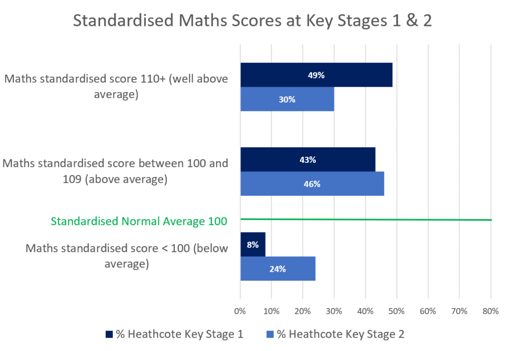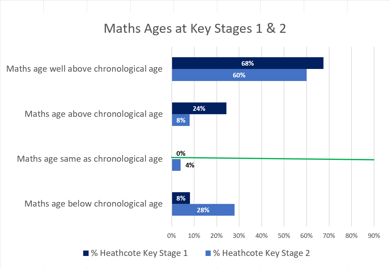 92% of Heathcote Pupils at Key Stage 1 and 72% at Key Stage have a maths age above their chronological age. Overall, 80% of the whole school have a maths age at or above their chronological age.