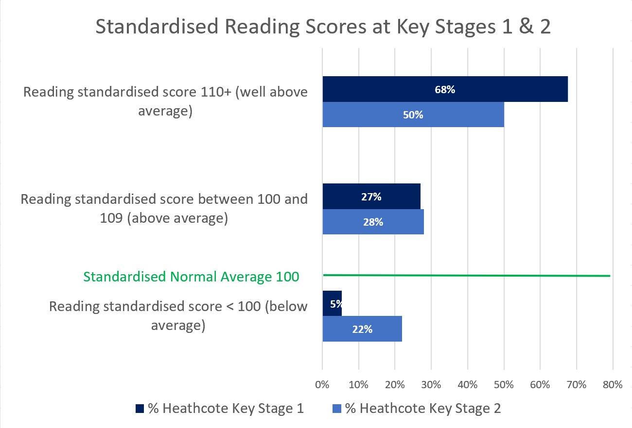 95% of Heathcote Pupils at Key Stage 1 and 78% at Key Stage 2 are above average in their reading scores. Overall, 85% of the whole school are above average in their reading scores.